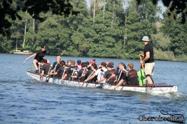 Diese erste Herausforderung gemeistert, stand man direkt unter Strom. Das allseits beliebte Kriech- bzw. Stromhindernis ließ die Muskeln zucken. Anschließend ging es auf das Gelände der ehemaligen NVA Kaserne, wo es einige Mauern, Hügel und Gestrüpp zu überwinden galt. Durch ein grünes Dickicht führte die Strecke ans Ufer des Röddelinsees, wo uns ein einmaliges „Hindernis“ , erwartet. Lange Kanus für jeweils 20 Mann lagen im Wasser. Mit Hilfe der Mitglieder des örtlichen Kanuvereins bestiegen wir die Boote. Zu Beginn eine sehr wacklige Angelegenheit. Nach ein paar Metern dachte ich „Super, jetzt kentern wir“. Aber langsam stabilisierte sich das Boot und die Mannschaft fand Ihren Rhtymus. Kräftige Ruderschläge ließen unser Kanu zielstrebig ans andere Ufer gleiten. Ausstiegspunkt war das Gelände eines Campingplatz, wo uns begeisterte Zuschauer anfeuerten.