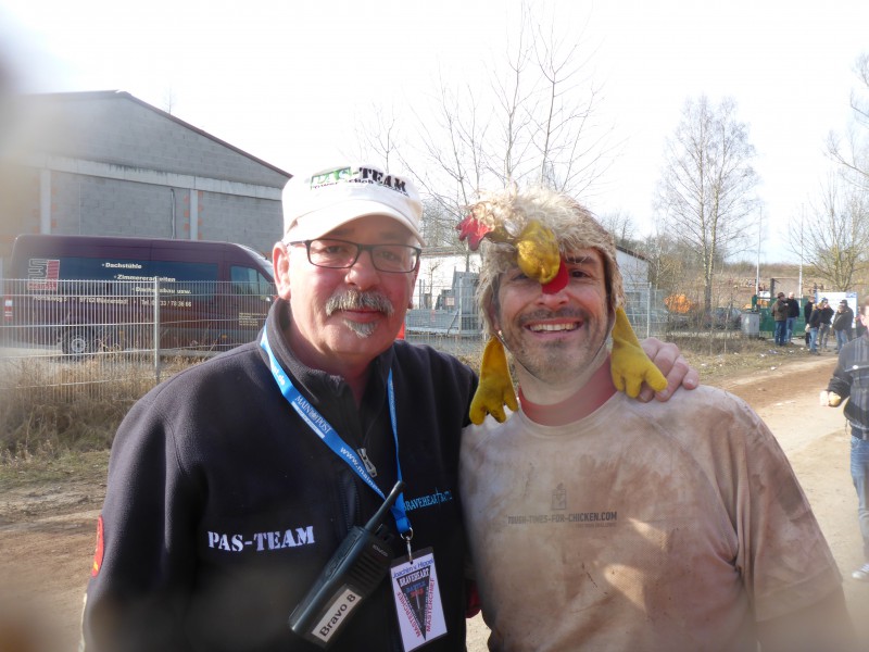 Das direkt anschließende Hindernis „Main-Post Trench“ bot mir erneut die Möglichkeit, mich kriechender Weise wieder etwas aufzuwärmen. Das klappte nur bedingt, weckte aber wieder die Lebensgeister. Nur nicht anhalten war die Devise. Immer in Bewegung bleiben. Etwas später passierte ich das Feuerhindernis, an dem man sich aufwärmen konnte. Das tat gut. Ein paar Minuten später verabreichten mir ein paar illustre Zuschauer, die sich an der Strecke häuslich eingerichtet hatten, einen grünen Likör oder Schnapps. Puhh, keine Ahnung was das genau war, aber es war Doping für die Geschmacksnerven. Auf ging`s zu Bauer Edi. Hier war ich dann etwas enttäuscht. Nicht von der Verpflegung, die war wie jedes Jahr super, sondern vom Hindernis. Früher galt es eine Strohwand zu überwinden, dieses mal war ein Labyrinth aus Strohballen aufgebaut. Und dies verursachte einen ziemlich ätzenden Stau, der mich wieder frösteln ließ. Die folgende Verpflegungseinheit bei Bauer Edi entschädigte etwas für das ungeschickte Hindernis. Nach einem kleinen Plausch mit einer der Damen, offensichtlich die Hausherrin, setzte ich mich wieder in Bewegung, gemäß dem Motto: „Warmlaufen“. Das schlimmste war nun auch überstanden. Kurz vor den „Sportics Fields“ lief ich noch dem entspannt dreinblickenden Masterchief in die Arme. Also nutze ich die Gelegenheit für einen kleinen Erfahrungsaustausch und ein Erinnerungsfoto BHB 2015. Soviel Zeit musste sein.