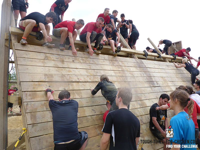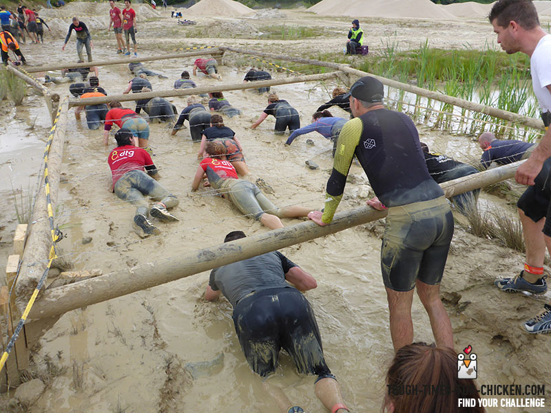 Und da kommt Einiges! Insgesamt 45 Hindernisse säumen die Zwölf-Kilometer-Strecke. Zum ersten Mal bis zur Hüfte im nassen Matsch zu stehen und durch einen Tümpel zu waten, ist gelinde gesagt ungewohnt, aber eigentlich ganz entspannt, da man nur gehen muss. Danach ist der Matsch normal. Die dreckige Hose, die an meinen Beinen klebt, spüre ich nicht. Wir klettern, springen, robben, kriechen und hangeln, meistens durch und über Schlamm. Es ist kalt und windig,der Regen wird stärker. Ich merke das nicht. Kurz denke ich an die Schwierigkeit mit den Strohballen am Anfang zurück und lächle darüber, wie sich meine Wahrnehmung verändert hat. Es folgen Stacheldraht, Autoreifen, Tunnel und Strom. Am Anfang frage ich mich noch, warum ich mir hier etwas beweisen will. Ob das die Midlife Crisis ist. Später denke ich gar nicht mehr. Ich laufe wie in Trance, bewerte nicht, funktioniere nur: Wie komme ich da hoch/durch/drunter/drüber? Es ist so herrlich klar, was zu tun ist. Und so herrlich schön, es geschafft zu haben. Als ich nach zwei Stunden durchs Ziel laufe, erinnere ich mich nur an die drei prägnantesten Hindernisse: den Sprung in voller Montur aus fünf Metern Höhe in einen matschigen See, eine steile schnelle Rutsche mit Landung im Wasser und drei etwa zwei Meter hohe Holzmauern, über die man klettern musste. Dieser ganze sinnlose Quatsch macht wahnsinnig Spaß! Das sehen wohl auch andere so. Im vergangenen Jahr liefen hier 6000 Menschen mit, dieses Jahr sind es schon 13 000.