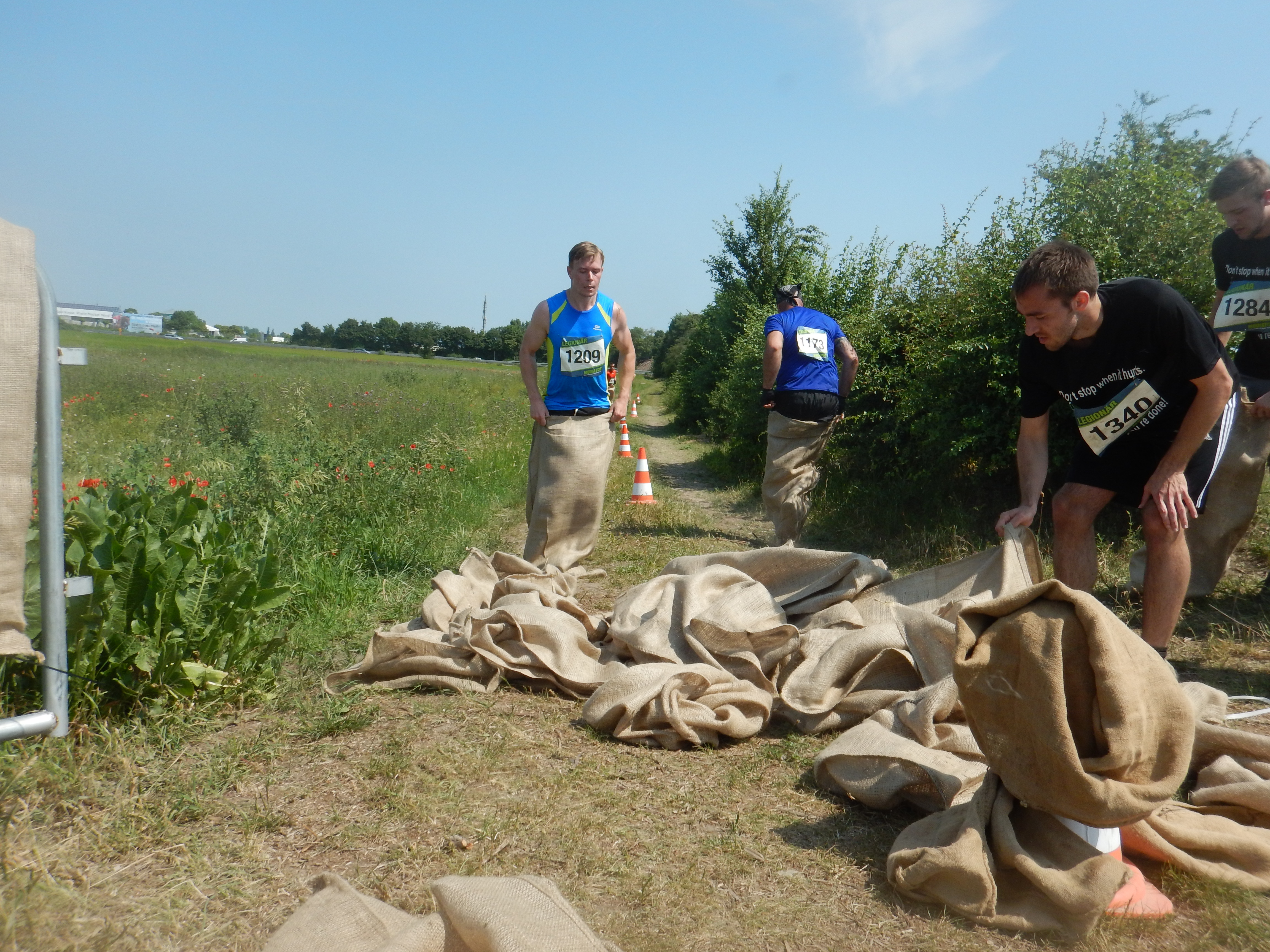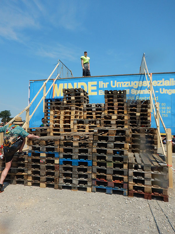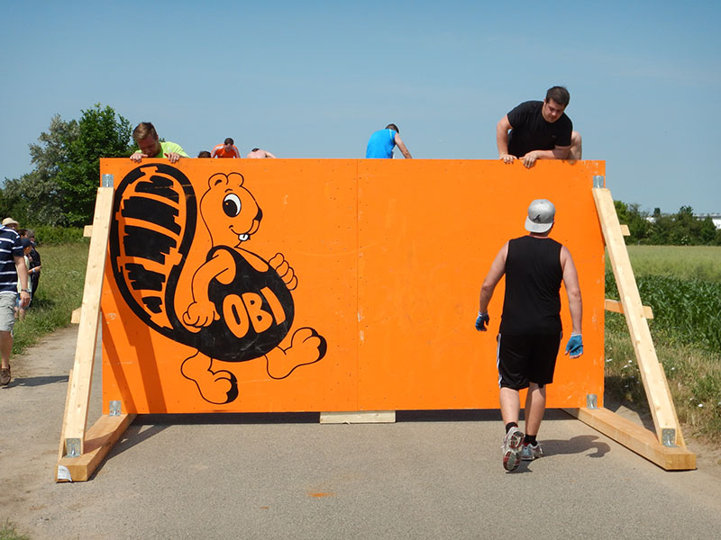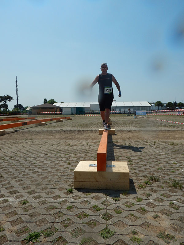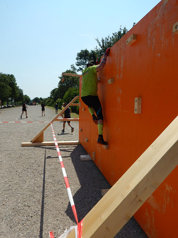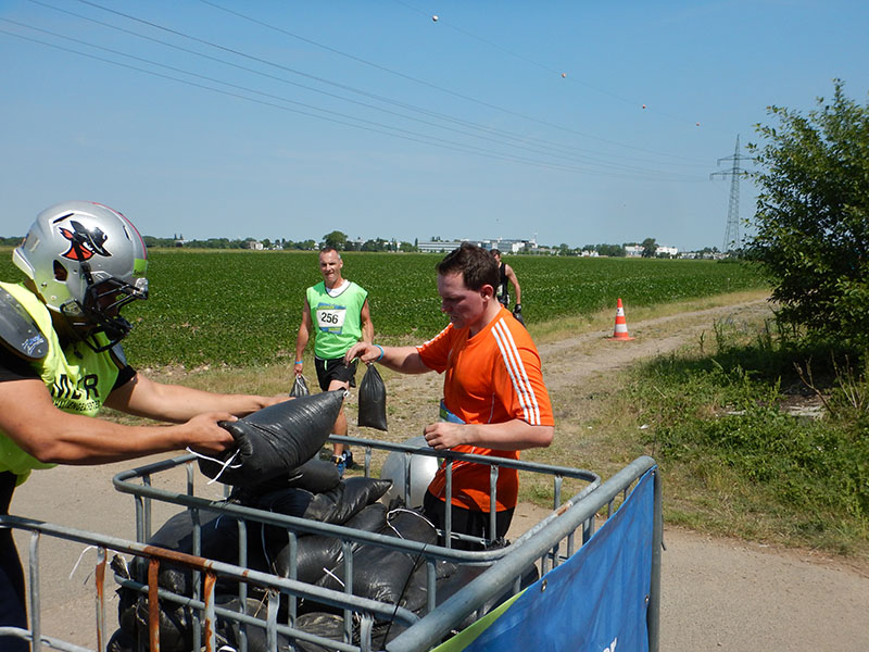 Unter einer Brücke erwartete die Läufer „Ballroom“, ein IKEA-Bällebad für Erwachsene. Eine schöne Idee. Schade nur, daß bei der zweiten Runde einige Bälle bereits auf den Feldern verstreut waren. Direkt im Anschluß wartet „Kraftprotz“ mit Sandsäcken auf die Läufer. In der rechten wie linken Hand musste jeweils ein Sandsack über ca. 40 Meter getragen werden. Neben dem Gewicht war das größte Problem, dass die Sandsäcke schwer zu greifen waren. Nach der Hälfte der Strecke spürte ich diese Tatsache in den Fingern. Also hieß es auf die Zähne beißen. Nachdem wir den Balast wieder abgelassen hatten warteten „The Walls“ auf die angehenden Mudiators. Drei hintereinander angeordnete Holzwände, die von Mal zu Mal höher wurden. Die ersten beiden meisterte ich in der ersten Runde noch ohne Abstützen an der Seitenstrebe, bei der Letzten nutzte ich diese, um die rund 3,50 Meter zu überwinden. Nach einer Wasseraufnahme ging´s zum „Frog Jump“, dem guten alten Sackhüpfen. Hört sich leicht an, bei einer entsprechenden Distanz kann dies aber sehr kräftezehrend sein. Weiter über die Feldwege, wo Holzstämme geschleppt und ein Kriechhindernis absolviert wurden. Langsam spürte ich die Hitze unter meinem Chicken, die sich Dank des wolkenlosen Himmels unaufhörlich steigerte. Ein schattiger Streckenabschnitt war aber leider nicht in Sicht. Der Parcour führte nun Richtung SAP-Arena, ehe es zum Maimarktgelände zurück ging. Es folgte „Tip Tap“. Eine Wand, an der die Teilnehmer mit Hilfe von kleinen Haltegriffen entlang klettern mussten, ehe der anschließende „Reifenwechsel“, ein Container mit Autoreifen, passiert wurde.