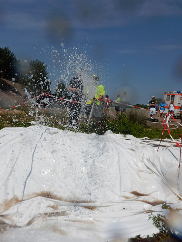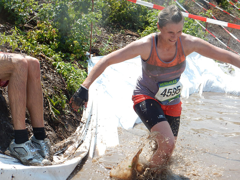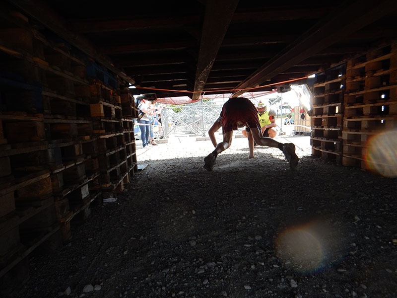 Die nächste Abkühlung brachte „Mud & Ice“, ein Wasserbecken, das mit Gittern abgedeckt war und kriechend bewältigt wurde. Eis, wie der Name des Hindernis vermuten ließ, konnte ich allerdings nicht entdecken. Die größte Challenge für mich war das kommende Hindernis „Affenhangel“. Drei Leitern, die versetzt angeordnet waren und deren Sprossen zum Ende hin immer weiter auseinander lagen. Sicherlich das schwertse Hindernis des Parcours. „Dank“ der nassen Hände wurde mir der Wechsel zur zweiten Leiter zum Verhängnis. So landete ich auf dem Asphalt. In der zweiten Runde klappte es dann, da ich vorab meine Hände so gut es ging trocken hielt. Eine erneute Abkühlung bekamen wir am „Mud Montain“. Ein „Rhein Neckar Bandit“, mit schwerem Gerät „bewaffnet“, spritzte uns kräftig ab. Bei dem Wetter genau die richtige Maßnahme zum richtigen Zeitpunkt :-). Hier ging es einige Mal den Hügel rauf und wieder runter, wobei das Terrain Dank des Wassers mit der Zeit immer rutschiger wurde. Langsam näherten wir uns dem Zielbereich. Diverse Kriech- und Kletter-Hindernisse mussten dabei noch gemeistert werden. Der „Power Slide“, eine aufblasbare Wasserrutsche, stellte den krönenden Abschluß der ersten Runde dar.