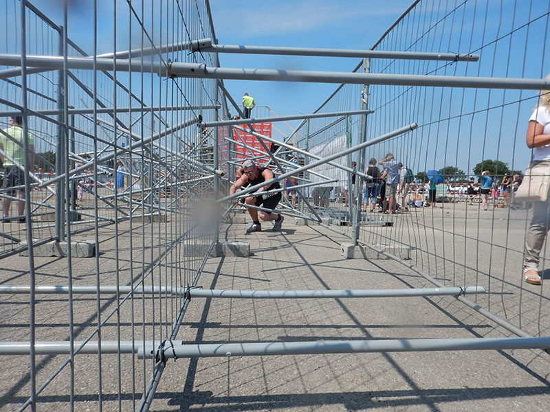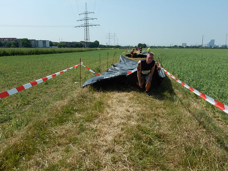 Um 11.00 Uhr ging´s dann los. Direkt nach dem Start folgten die Hindernisse Schlag auf Schlag. „Tyre Jump“, „Labyrinth“, „Schaumparty“, „Small Tyre“, „The Gates“ um nur einige zu nennen. Nach den ersten Hürden kam die erste kalte Dusche von einem Teammitglied der „Rhein Neckar Bandits“. Was angesichts der Temperaturen gar nicht schlecht war. Dem Sprung in den Wassercontainer folgte der Kampf gegen den Wasserstrahl eines Feuerwehrschlauchs. Je näher man rückte, desto stärker wurde der Widerstand. Nach ein paar Metern hieß es deshalb umdrehen und rückwärts weiterlaufen. Das war ich meinem Chicken auch schuldig. Nach dem „Drag Race“, bei dem man mindestens zu zweit einen LKW Reifen schleppen musste, und der „Heupyramide“ ging es über die „Fence Road“ auf´s freie Feld. Hier entzerrte sich das Teilnehmerfeld der ersten Startgruppe recht schnell.