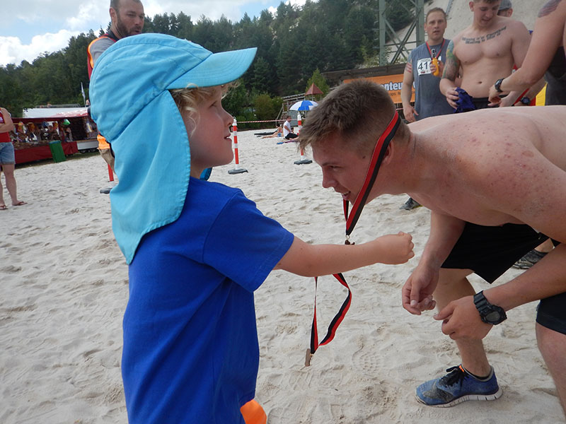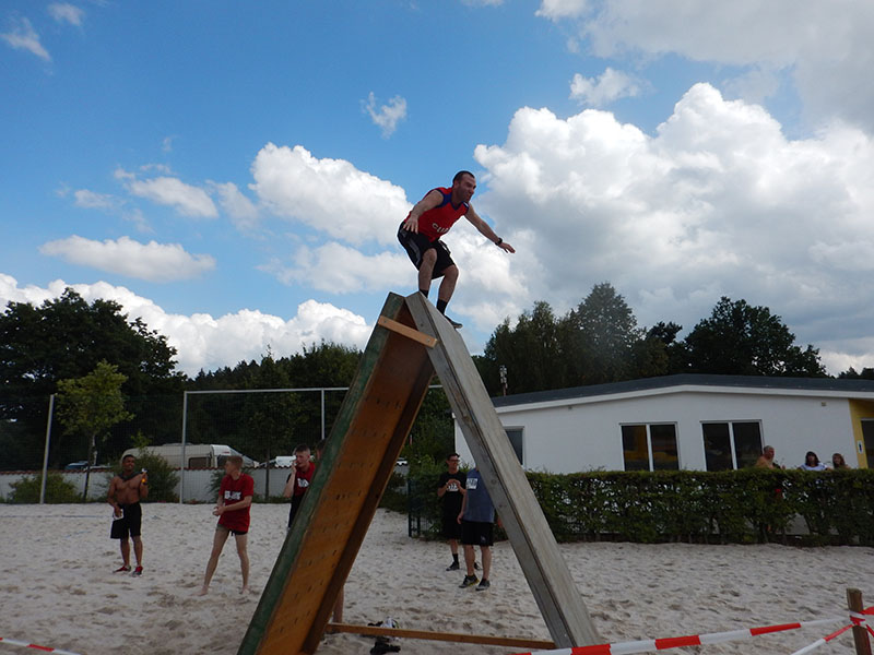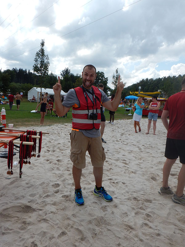 Einige handbreite Baumstämme waren hintereinander angeordnet und sollten balancierend gemeistert werden, was recht gut klappte. Dies war gleichzeitig auch der Scheitelpunkt der Strecke. Sie führte nun bergabwärts zurück Richtung Monte Kaolino. Auf dem Weg waren noch ein paar Kriechhindernisse platziert. Zurück am Fuße des „Sandhügels“ warteten noch ein paar Herausforderungen auf uns. Zwei weitere Kriechhindernisse in Form von Netzen stellten dabei kein Problem dar. Die folgenden Traktorreifen („Tire Change“) mussten jeweils 3 Mal gewendet werden. Unterschiedliche Reifengrößen ermöglichten es jedem Teilnehmer, diese Aufgabe zu bewältigen. Nur das letzte Hindernis, die zwei „A“s waren für mich zu hoch um sie alleine zu bewältigen. Ohne fremde Hife war es für mich nicht möglich, diese annähernd senkrechten Holzwände zu überwinden. Da ich zu diesem Zeitpunkt und an dieser Stelle alleine unterwegs war bot mir glücklicherweise ein Zuschauer aus dem angrenzenden Freibad seine Hilfe an. Schnell die Räuberleiter gebaut und schon war die erste Runde bezwungen.