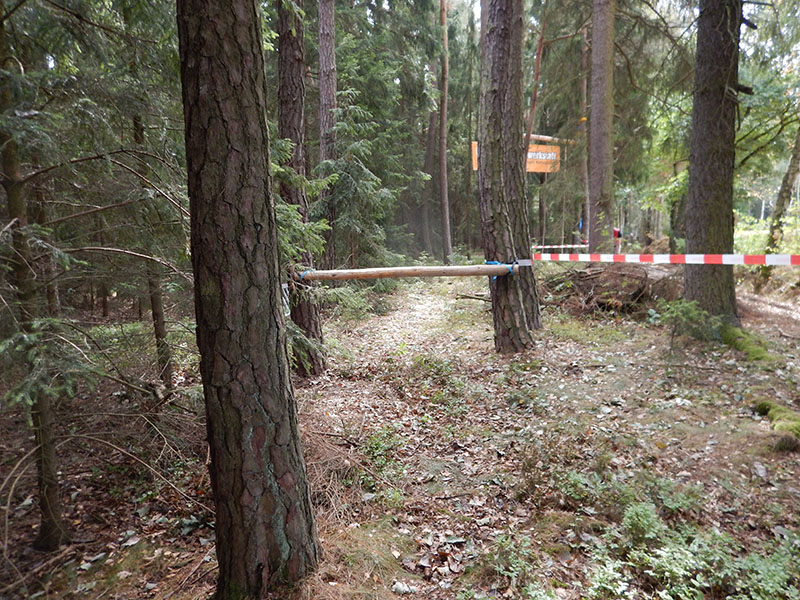 Und dann kamen sie wieder. Die Ringe an der Schnur. Rund 10 Ringe waren wie an einer Perlenschnur von Baum zu Baum aufgehängt. Diese Variante ist Dank ihrer flexiblen Fixierung tükisch. Leider wippte das Seil so stark, dass ich nach ein paar gemeisterten Ringen abrutschte. Ärgerlich, aber ich nahm´s sportlich. Also hieß es 10 Burpees abreißen ehe es zum Schießstand ein paar Meter ging. Direkt daneben befand sich auch die erste Verpflegungsstation an der sich die Läufer mit kleinen Snacks und ausreichend Flüssigkeit versorgen konnten. Nach einer kurzen Wartezeit ging es in die Horizontale. 3 unterschiedlich große Metallscheiben waren mit einem Luftgewehr zu treffen. Erstaunlich. Die Gewehre waren recht gut justiert, sodass die Trefferquote bei mir sehr passabel war. Nach 5 Schuß führte mich die Strecke weiter bergauf in den Wald. Es folgte „Hard Balance“.