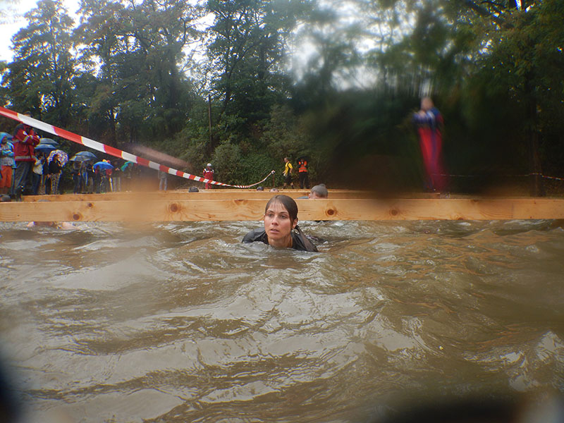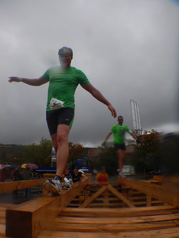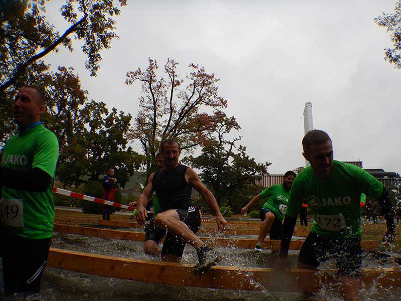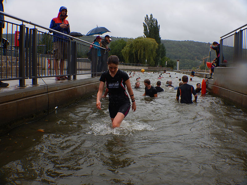 Um 12 Uhr ging es in der ersten Stratgruppe mit einem Sandsack auf den Schultern los. Die ersten Kilometer waren durch lange Laufstrecken geprägt. Ein paar einfache Kriech- und Kletterhindernisse auf der Strecke führten zu einer Entzerrung des Teilnehmerfeldes. Erst ging es am Mainufer entlang, wobei nach rund 4 Kilometern eine Kehrtwende eingebaut war. Auf dem Rückweg hieß es dann: Schwimmen. Tatort war ein kleines Hafenbecken. In Erwartung kalter Temperaturen begaben wir uns in die Fluten. Doch der Schein trügte. Das Wasser war wohltemperiert, geradezu ideal für eine Schwimmeinlage. Zurück am Viehmarktplatz erwartete uns eine geballte Ladung an Hindernissen. Wasserbecken, Strohballen, Container, Autowracks, Holzwände, Räuberleiter und ne Monkeybar brachten den Lauf-Rhythmus durcheinander.