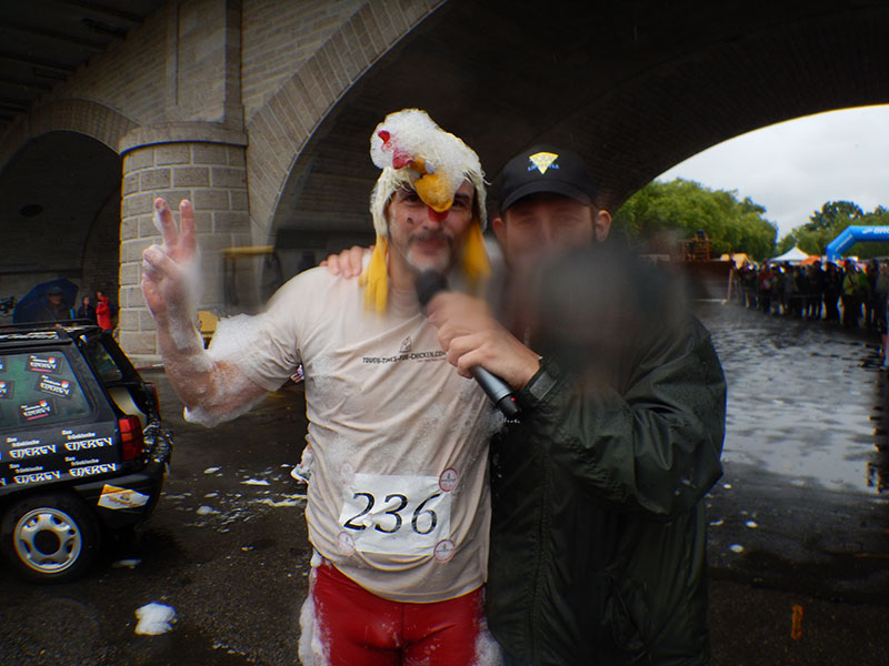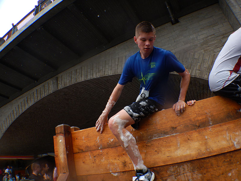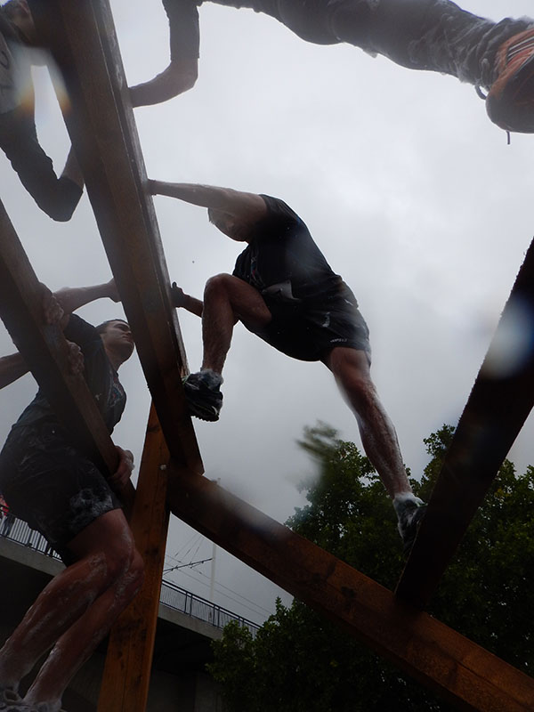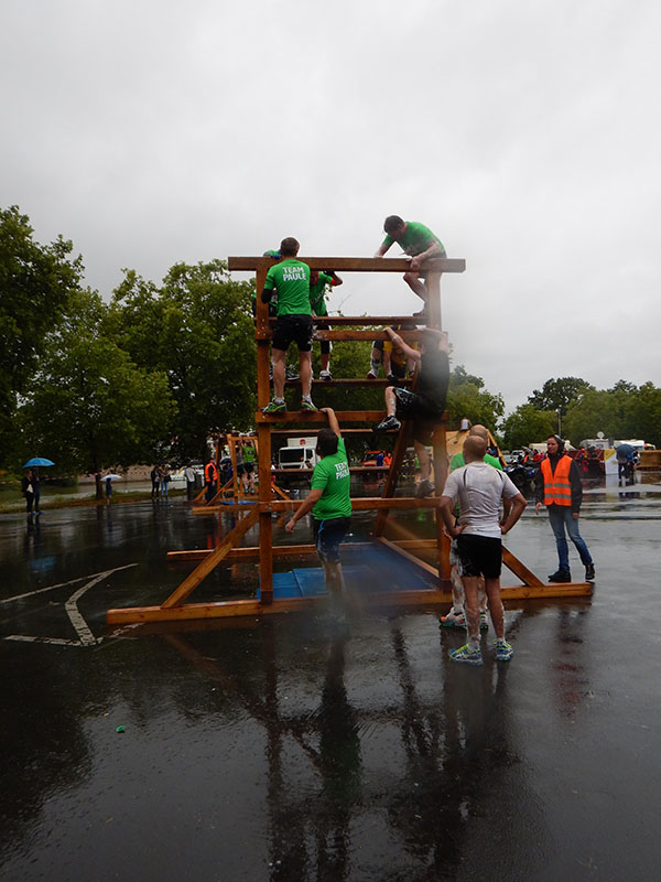 Ein weiteres Mal musste das „Battlefield“ am Viehmarktplatz bezwungen werden. Insbesondere die Kletterwand als auch die Monkeybar waren durch den Regen ziemlich schmierig geworden. Das machte die Überwindung dieser beiden Hindernisse nicht gerade einfacher. Aber so kurz vor dem Ziel mobilisierte ich die letzten Kräfte. Nach 18 Kilometern und 2:16:03 ging es durchnässt über die Ziellinie.