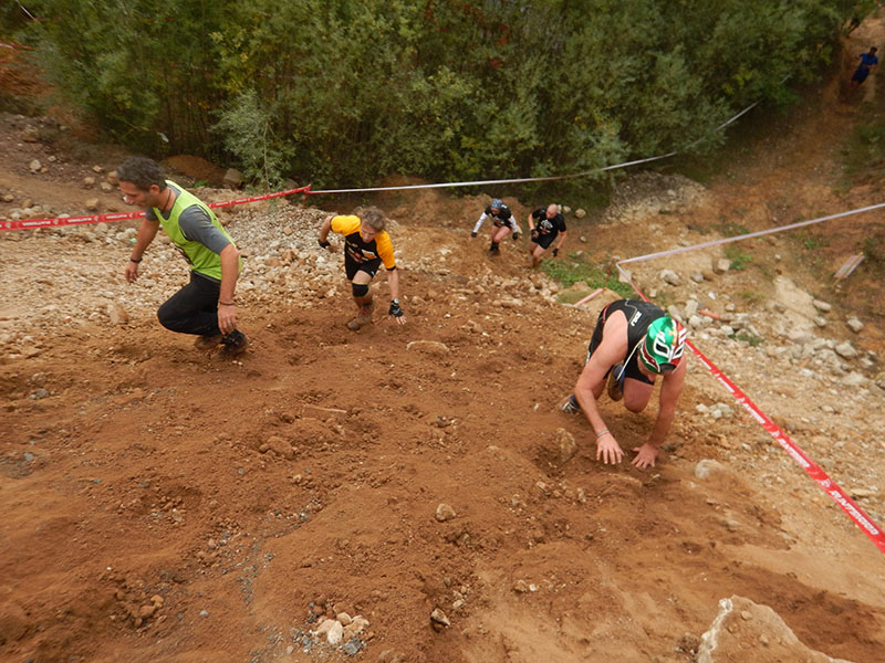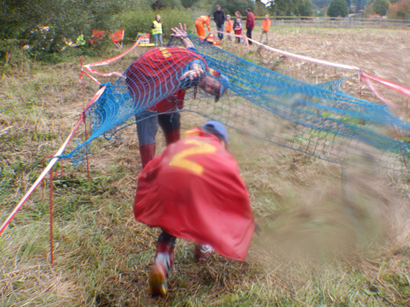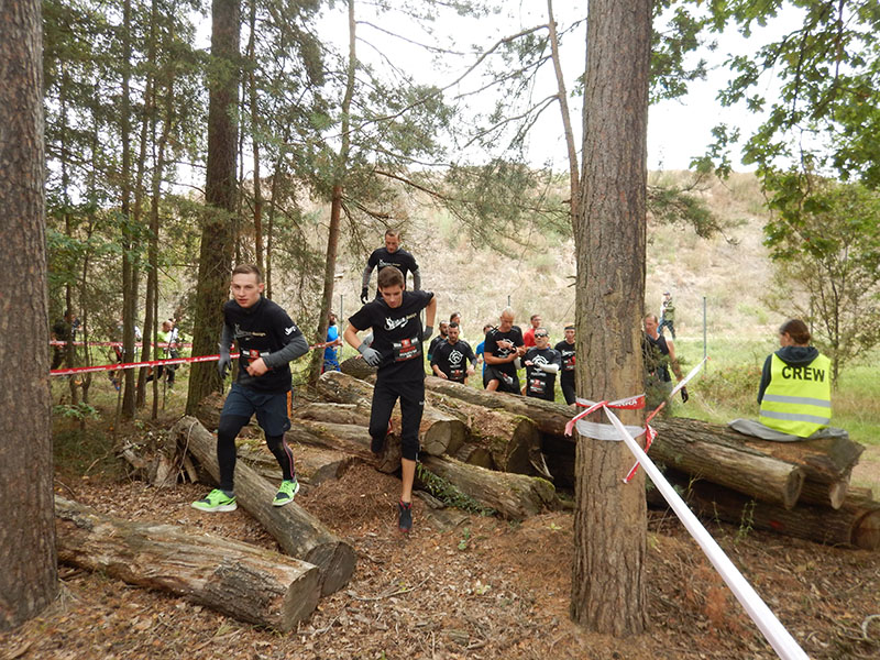 Als wir auf das Areal einbogen, versperrten uns zwei hintereinander aufgestellte, rund 2 m hohe Betonwände, den Weg. Diese waren leicht schräg gestellt und am First recht breit, weshalb sie nicht so einfach zu überwinden waren. Doch mit Teamgeist wurde auch dieses Hindernis gemeistert. Das Gelände eignete sich hervorragend für viele kleine An- und Abstiege. So ging es einige Male hoch und wieder runter, vorbei an Containern, alten Autoreifen, Autowracks und künstlichen Mauern. Nach so vielen Leibesübungen stand erst mal ein Schlammbad an. Eine 20 Meter lange Schlammfurche, bewacht von zwei „Schlammskelettons“ bremste die Läufer ab. Nach der zähen Pampe, die bis zu den Oberschenkeln reichte, ging es mit schwerem, matschigem Geläuf direkt den nächsten Hügel hinauf. Einfach einmal Durchatmen war schwer. Wenigstens bot die kurz darauf folgende Versorgungsstation die Möglichkeit, die Akkus etwas aufzuladen. Kletternd und kriechend ging`s weiter, ehe die Strecke in den Wald führte. Auf der zwischen Bäumen gespannten Slackline konnte man seinen Gleichgewichtssinn trainieren. Danach hieß es erst mal laufen und ein paar Meter machen.