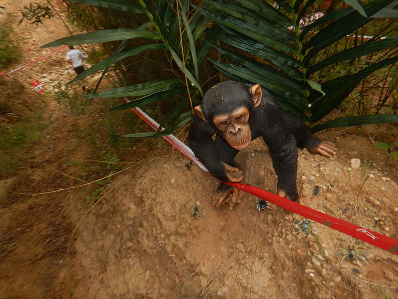 Mit der Startnummer 1502 ausgezeichnet ging`s los. Anfangs war die erste Startgruppe der 24 km Läufer recht dicht zusammen. Der hügelige Rundkurs und nicht zu schwere Hindernisse zu Beginn bewirkten, dass nach den ersten Kilometern eine Entzerrung des Teilnehmerfeldes erfolgte. Zu Beginn standen einige Kriechhindernisse, Wassergräben und wieder Kriechhindernisse auf dem Zettel. Und immer wieder Sand- und Dreckhügel, die sich im späteren Verlauf auf die Physis auswirkten. An einem der Kriechhindernisse wehte ein Hauch von Hollywood durch die fränkische Prärie. Eine Produktionsfirma hatte es mit Filmmusik beschallt und mit einem geduldigen Statisten in Gestalt eines Schimpansen versehen. Da kam ein Gewisses Indiana Jones Feeling auf. Nach dem folgenden Sandsackschleppen ging es auf das Gelände der Erddeponie Zirndorf.
