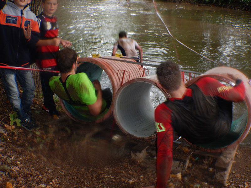 Bis zum Hindernis Nr. 35. Dieser letzte Streckenabschnitt sorgte Dank einiger Wasserhindernisse für die richtige Abkühlung, die man bei den vorherrschenden Temperaturen eigentlich nicht benötigte. Es begann mit zwei in der Bibert liegende Kanus, die tauchend bezwungen werden mussten. Das ließ bei dem ein oder anderen die Schnappatmung einsetzen. Ich muß zugeben, das Wasser war für die Jahreszeit schon gut abgekühlt. Weiter zu ein paar Röhren durch die man ins Wasser des besagten Flüßchens glit. An dieser Stelle wechselte man das Ufer. Das finale Wasserhindernis bildete eine ca. 4