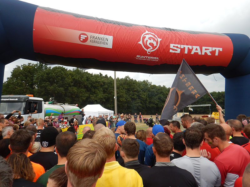 Am Samstag, den 26. September 2015 war es soweit. Der 2te RUNTERRA Hindernislauf in Zirndorf stand auf dem Programm. Bei der Premiere im letzten Jahr mußte ich krankheitsbedingt leider passen und verfolgte das Geschehen online bei der Live-Übertragung. Diesmal hatte ich das Glück fit zu sein, obwohl mir die 4 1/2 stündige Anfahrt aus dem Rheinland schon etwas in den Knochen steckte. Die Parkplatzsituation war trotz ausreichend ausgewiesener Flächen etwas chaotisch. Doch Dank der Toleranz der umliegenden Gemeinden fand auch ich ein Plätzchen für mein Gefährt am Wegesrand. Schnell die Schuhe angezogen und ab ging´s Richtung Eventgelände. Die Veranstaltung war gut besucht, die Stimmung fröhlich ausgelassen. Da ich recht spät dran war, klappte das erledigen der Formalien recht zügig. Vor dem Start zogen die einzelnen Teams mit viel Getöse in den Startbereich ein.