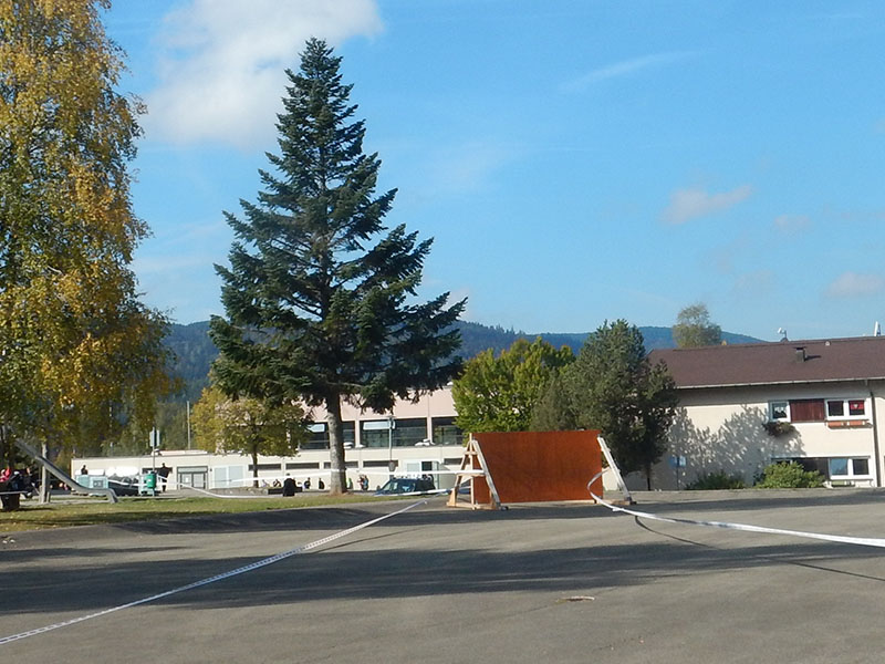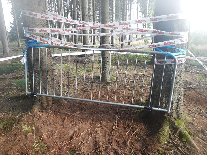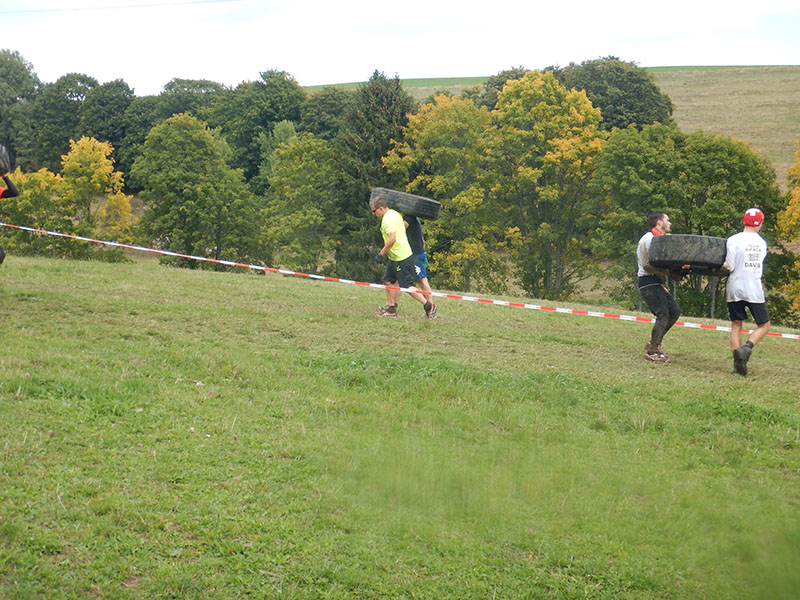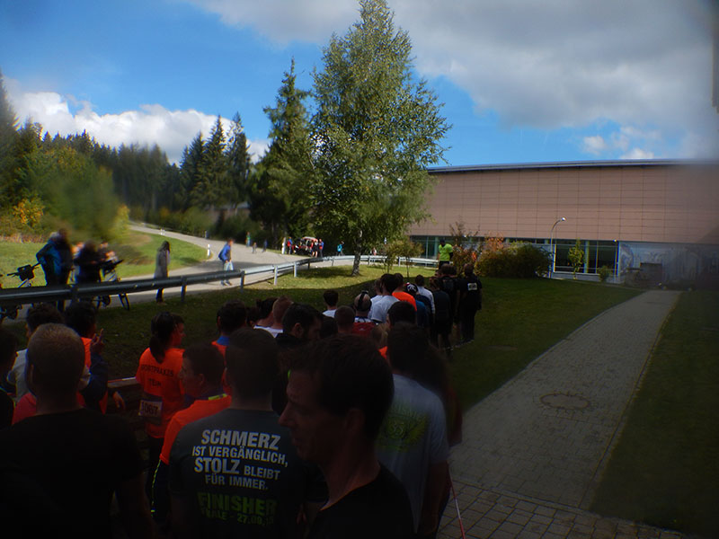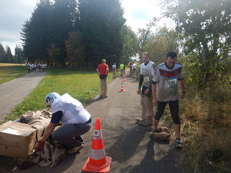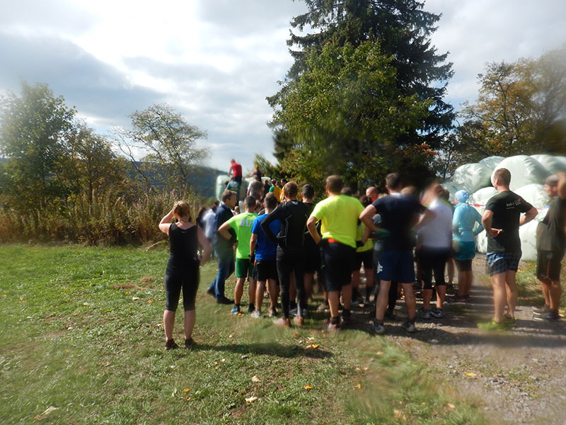 Als ich vor der Straßensperre stand, war ich ratlos. Was sollte ich tun, die Landstraße war komplett gesperrt, mein Navi zeigte aber genau in diese Richtung. Und einen so großen Zeitpuffer hatte ich nicht eingerechnet. Da entdeckte ich kurz hinter der Absperrung einen Feldweg, der den Anschein machte, als führte er in die richtige Richtung. Ich studierte die Navi-Karte, entschied mich dann mein Glück zu versuchen. Der Weg führte bergab durch ein Waldstück. Langsam tastete ich mich mit meinem Fahrzeug durch den Wald. Alte Grenzsteine am Wegesrand erweckten den Eindruck, als ob es sich um die alte Streckenführung handelte. Wo mochte ich nur rauskommen? War am Ende des Weges die Straße womöglich auch noch eine große Baustelle? Ich wußte es nicht. Nach ein paar Kilometern erreichte ich die Landstraße Richtung Rothaus. Heureka. Ich hatte Glück. Weiter gin´s zum Mudiator Finale. Nach halbstündiger Fahrt tauchte auf der rechten Seite das Gebäude der Badischen Staatsbrauerei Rothaus auf. Und da waren bereits einige Hindernisse vor den Brauereigebüuden aufgebaut. Super, dachte ich. Trotz der unfreiwilligen Verzögerung noch rechtzeitig geschafft. Ich parkte auf dem Parkplatz um meine Unterlagen abzuholen. Merkwürdig. Hier war recht wenig los. Eine Beschilderung: Fehlanzeige. Also fragte ich einige Streckenposten, wo ich die Startunterlagen abholen könne. Es dauerte bis ich jemanden fand, der mir mitteilte, dass diese unten am Schluchsee ausgehändigt werden würden. Hier oben wäre nur der Startbereich für die Legionäre, also die Läufer, die 8 Kilometer absolvierten. Ok, dachte ich, dann nichts wie runter zum Schluchsee. Dort erwartete mich dann ein kleines Parkplatzchaos. Bedingt durch die geografische Lage gab es keine weitläufigen Parkplatzmöglichkeiten. Da die wenigen Plätze am Start- und Zielbereich bereits belegt waren, machte ich mich auf die Suche nach einem Platz in dem kleinen Ort. Nach einigem Suchen fand ich einen Parkplatz, der rund 10 Gehminuten vom Eventgelände entfernt war. Durch die ganzen Unwägbarkeiten hatte ich natürlich viel Zeit verloren. Auf dem Weg zum Eventgelände hörte ich die Durchsage, daß die erste Gruppe der Hercules Läufer (16 km+) an den Start gingen. So rechnete ich damit, in einer späteren Gruppe zu starten. Zu allem Überfluss spielte plötzlich auch noch mein Magen-Darm-Trakt verrückt. Schöne Bescherung, aber auf den Lauf verzichten wollte ich auch nicht. Nachdem ich meine Startnummer befestigt und meinen Autoschlüssel abgegeben hatte, begab ich mich zum Startbereich. Dieser sah ziemlich verlassen aus. Konnte es sein, daß alle bereits unterwegs waren? Ich fragte einen Verantwortlichen, ob und wo ich den starten könne. Nach einigem Hin- und Her teilte er mir mit, dass die Zeitmessung bereits abgebaut wäre und ich nur die Möglichkeit hätte, ohne Zeitmessung zu laufen. Hmm, das war eine halbe Stunde nach der ersten Startwelle. Schade, dachte ich, machte mich aber dennoch auf Richtung Rothausbrauerei. Es hatte ja auch seinen Vorteil, alleine auf der Strecke zu sein. So konnte ich wenigstens Wartezeiten an den Hindernissen vermeiden :-).