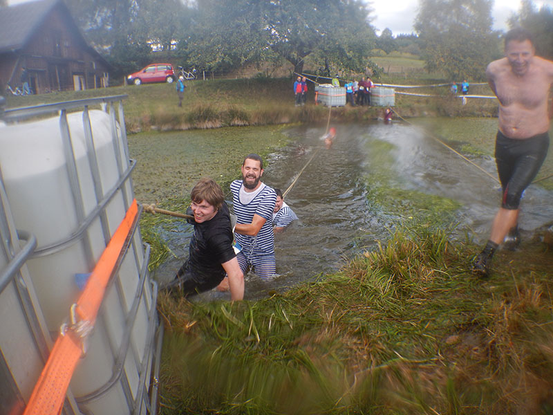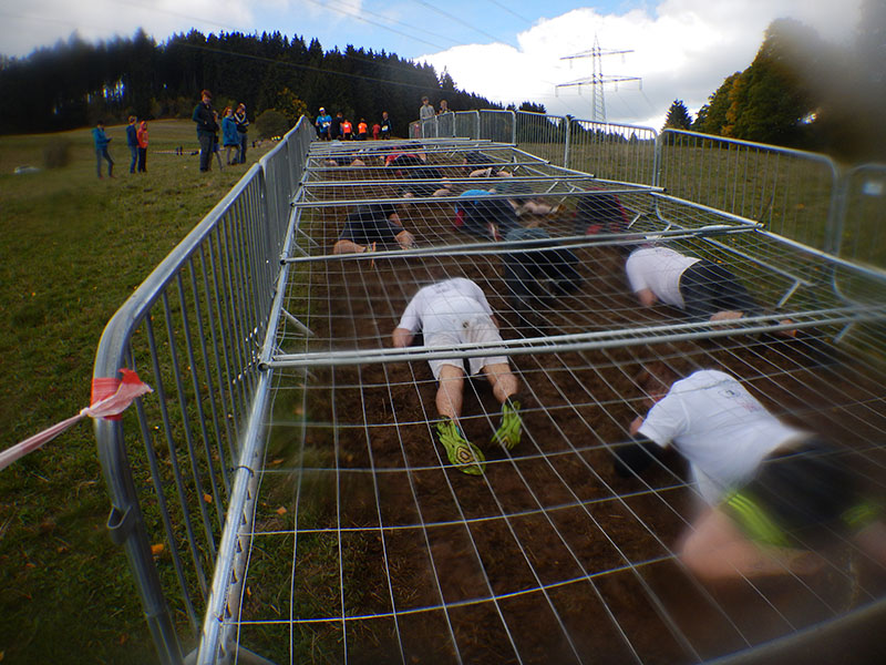 Als erstes, meines Erachtens auch schwierigstes Hindernis, standen Ringe, an denen man entlang hangeln musste, an. Hier fehlte mir einfach die Energie, diese sauber zu bewältigen. So stieg isch nach einem kurzen Versuch aus, gefolgt von ein paar Burpees. Hinter dem Brauereigebäude folgte ein Kriechhindernis, einer Röhre mit „Wasseranschluß“. Hier bildete sich ein langer Stau. Das verwunderte mich nicht, da ab jetzt Legionäre und Herkules-Teilnehmer auf derselben Strecke unterwegs waren. Ich entschied mich ein paar Straf-Burpees zu machen und das Hindernis zu umgehen. Mir war einfach zu kalt, um länger im Schatten stehen zu bleiben. Nach einem erneuten Balancierbalken musste an einem frei hängenden Seil empor geklettert und eine Glocke geläutet werden. Das hatte ich ganz gut hinbekommen. Nach einem kurzen Querfeldeinlauf erreichten wir eine Art „Wasserhindernis“. Die stinkende, kaltgrüne Brühe musste mit Hilfe eines Seils durchquert werden. Brrhhh, angenehm war anders. Weiter ging´s durch den schönen Schwarzwald vorbei an Kriech- und Wasserhindernissen, Strohballen oder Autoreifen Richtung