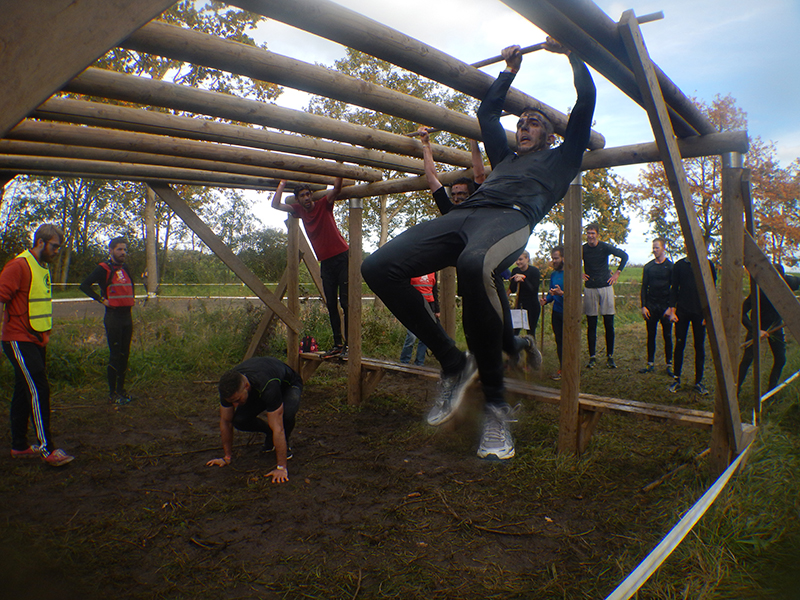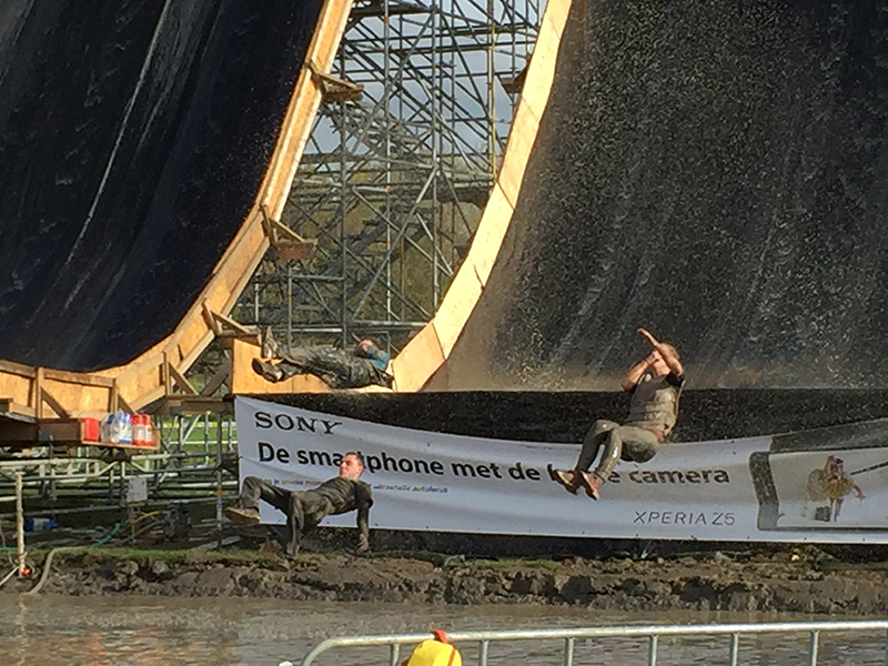 Anschließend ging es auf die Strecke im Spaarnwoude Park, einem hügeligen Freizeitgelände mit Skihalle. Die erste Übung waren die „Dragon Ropes“, frei hängende Seile, die es zu erklimmen galt. Dank ausgiebigen Übens stellte das für mich kein Problem dar. Weiter ging´s auf Odins Spuren, vorbei an „Carry a Viking“ und „Tunnel Hurdels“ zum Hindernis „Raise a Sail“. An dieser Station musste ein Gewicht, welches an einer Seilwinde befestigt war, in die Höhe gebracht werden. Die folgenden „Mud Trenches“ ließen die Angelegenheit dann das erste Mal richtig schmutzig werden. In regelmäßigen Abständen folgte einem Schlammhügel ein Schlammloch. Lecker. Einige hundert Meter weiter kam mit „Throw the Axe“ die erste Wikingerübung. Hier galt es mit einer Holzaxt ein Schild, das in rund 10 Meter Entfernung war, zu treffen. Leider verfehlte ich das Ziel, was 10 Burpees für mich zur Folge hatte. Bei „Hammer Banger“ wurde mit einem Holzhammer ein Baumstamm, der in einem Gerüst hing, von der einen zur anderen Seite geschlagen. Das war recht einfach, wobei „Crawl Up“, eine Kriechstrecke, die bergauf verlief, nicht so bequem war. Der gespannte Stacheldraht sorgte dafür, dass der Pöter immer schön am Boden blieb. Nach weiteren Prüfungen galt es bei „Storm the Castle“ die