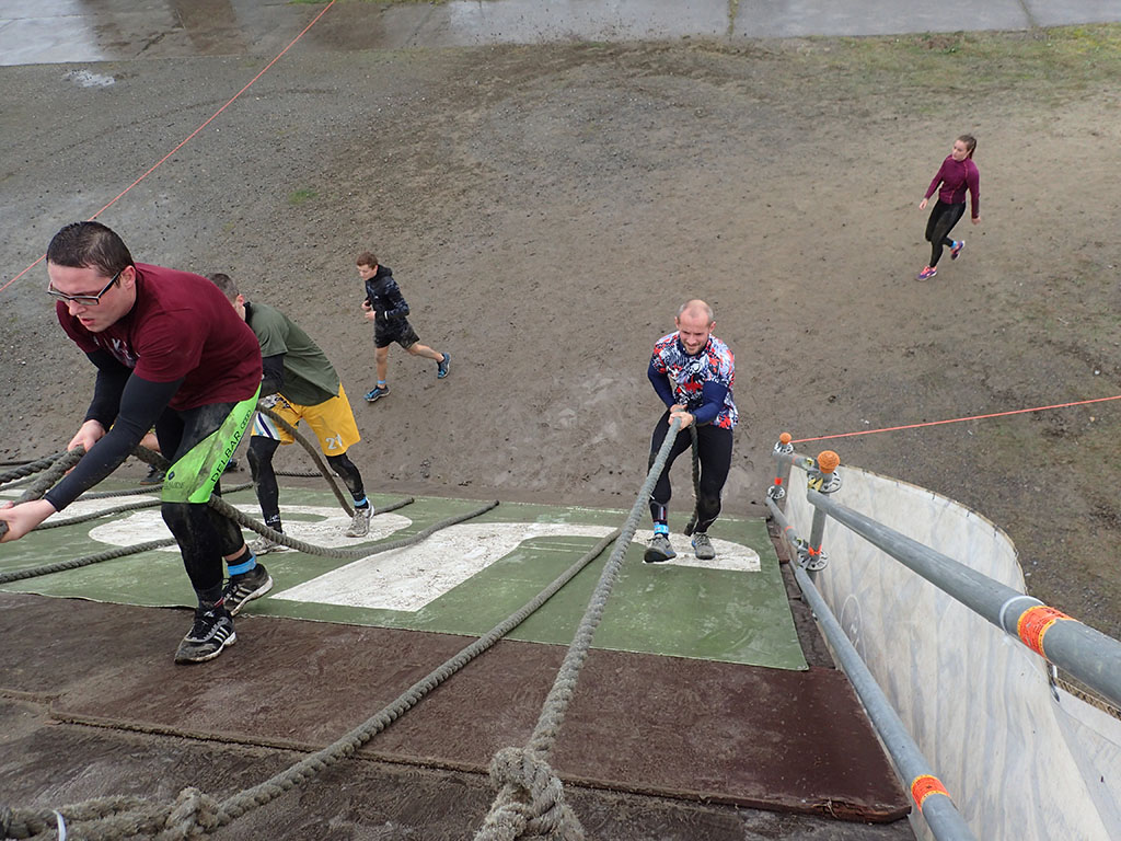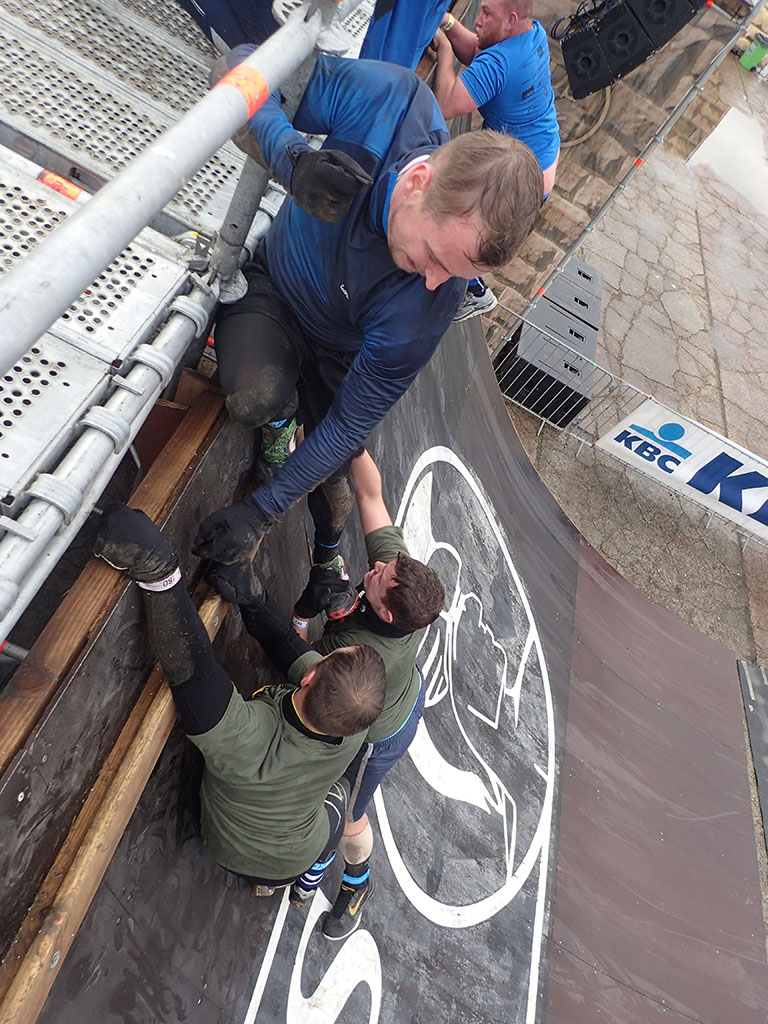 Nach dem Start ging es vom Kaserengelände raus auf’s freie Feld. Das erste Kriechhindernis „Bellyscraper“ war zwar lang, konnte ich aber gut meistern. Das Teilnehmerfeld hatte sich bereits recht gut in die Länge gezogen, Wartezeiten gab es praktisch keine. Die erste größere Hürde stellte die Halfpipe „Ramp Attempt“ dar. Die glatt beschichtete Halfpipe war aufgrund des Regens, der im Laufe des Tages immer wieder einmal einsetzte, recht schmierig. Dies machte mir bei den ersten beiden Versuchen entsprechende Schwierigkeiten. Ich erreichte jeweils mit meiner Hand den Querbalken, der oberhalb der Halpipe angebracht war, vermochte aber nicht, mich richtig festzuhalten, da auch der Balken durch den Regen nicht mehr den optimalen Grip bot. So rutschte ich bei den ersten Versuchen wieder abwärts. Beim dritten Mal konnte schaffte ich es dann, den Balken richtig zu greifen, schwang mein linkes Bein nach oben und zog mich auf die Plattform, die am oberen Ende der Halpipe angebracht war. Zugegeben, es war ein Stück Arbeit, klappte aber trotz suboptimalen Geläufs besser als gedacht. Ein paar 100 Meter weiter stand anschließend „Ring the Bell“ auf dem Programm. Hier galt es ein rund 5 Meter langes, frei hängendes Seil nach oben zu klettern, und wie der Name schon vermuten läßt, eine Glocke zu läuten. Diese Übung beherrsche ich zwischenzeitlich recht gut, sodass es für mich kein Problem darstellte, das Ziel in luftiger Höhe zu erreichen. Der ein oder andere tat sich da schon schwerer, was auch verständlich war. Mir ging es anfangs genau so, ehe ich es Leid war und mir ein Übungsseil un einen Baum in meinem Garten hing. Letztendlich ist es nicht nur eine Frage der Kraft, sondern auch der Technik. Weitere Hindernisse wie die berüchtigten Autoreifen, eine Schräge, die mit Hilfe eines Seiles erklommen werden musste und zahlreiche Strohballen stellten sich uns in den Weg.