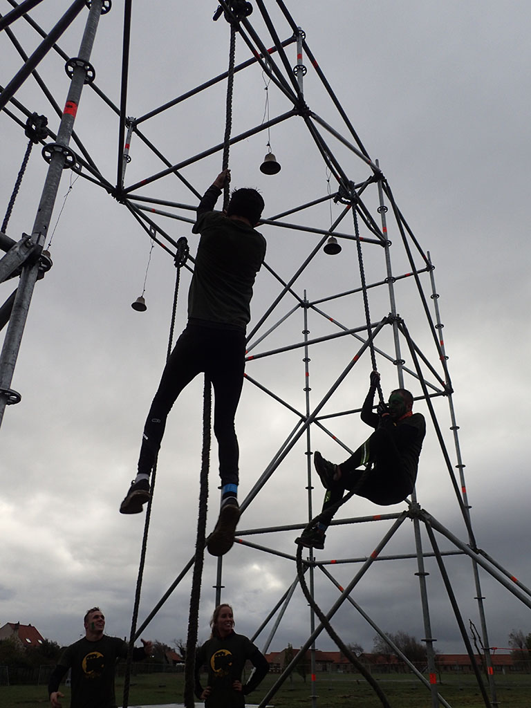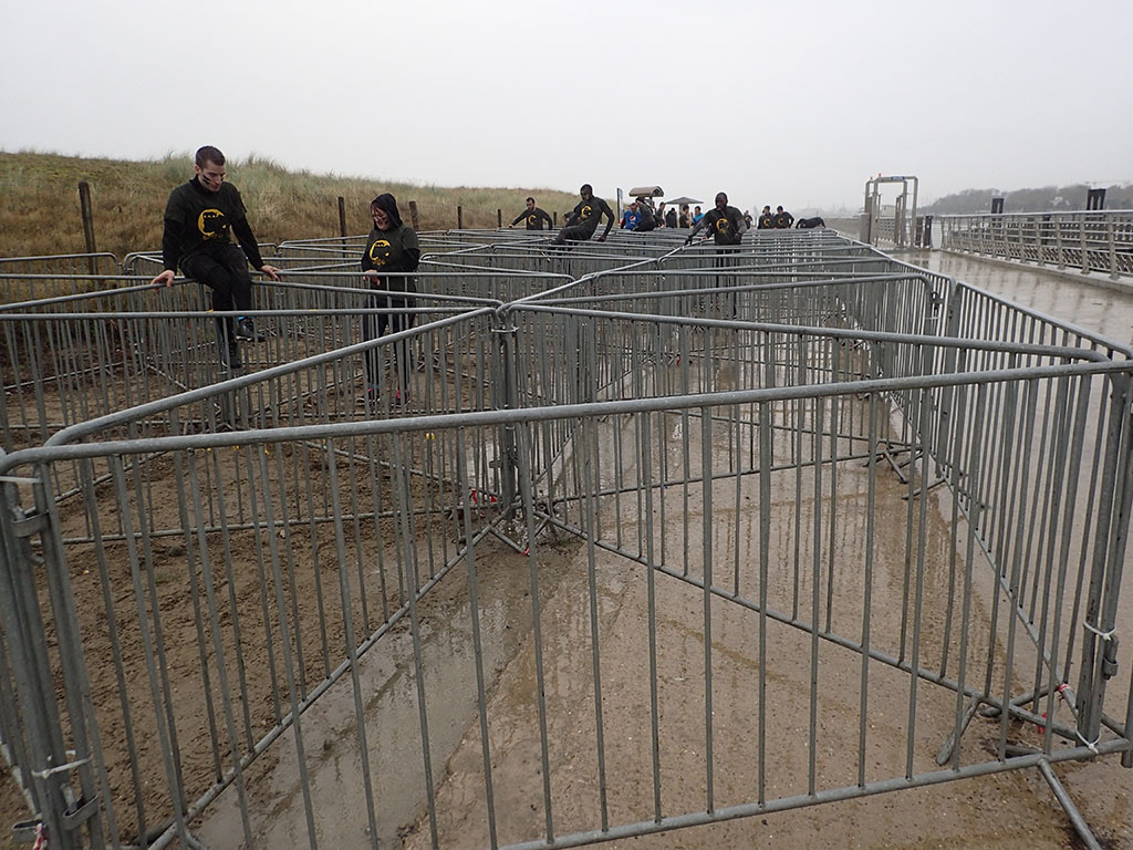 Ein weiteres Highlight war Monkey Island, der Hangelklassiker inkl. darunter liegendem Wasserbecken. Aus Gerüststangen gebaut, kann auch hier der Grip, je nach Witterungsverhältnissen, für die Hände problematisch sein. Die Veranstalter haben das gut gelöst, indem sie Schmirgelpapier auf die Metallstangen geklebt haben. Eine gute Idee wie ich finde und in dieser Form das erste Mal gesehen. Nachdem ich das Hindernis ohne Schäden gemeistert hatte ging es über weitere Hindernisse wie Balken, zahlreiche Wände und über Absperrzäune raus aus der Kaserne Richtung Strand.