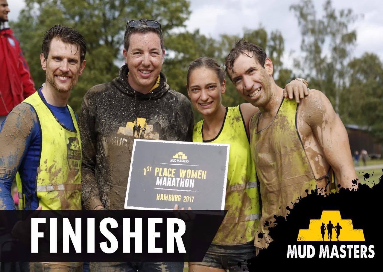 Zwei Mal noch die Monkey Bars, zwei Mal der Flyer und zwei Mal der Strom. Zähne zusammengebissen. Die Strecke erschien härter, länger und schlammiger. Dennoch – im Dreiergespann durchaus machbar. 6 km später und circa vier Stromschläge pro Nase geht es auf die letzten 6 km. Alex lief voraus, Pia und Aaron folgten ihrem Zugpferd. Ein letztes Mal die Monkey Bars – geschafft, den Flyer genossen, der Sizzler – gepiekst. Die letzten 100 Meter. Die Hände gehen zusammen und wir laufen ins Ziel ein. Nach rund 5:11 Stunden ist es geschafft. Mud Masters Marathon Luhmühlen 2017. Im Ziel erwarten uns 3 erfreuliche Dinge: Die Finisher Medaillie, der Sieg von Pia in der Kategorie Women Marathon und ein flottes Bad unter den Monkey Bars um den Matsch loszuwerden.